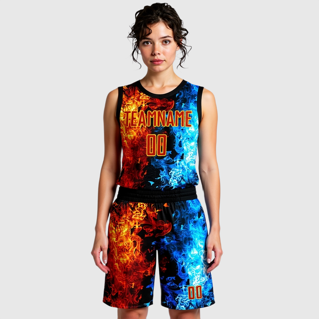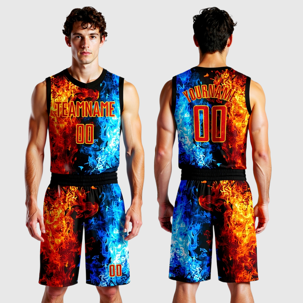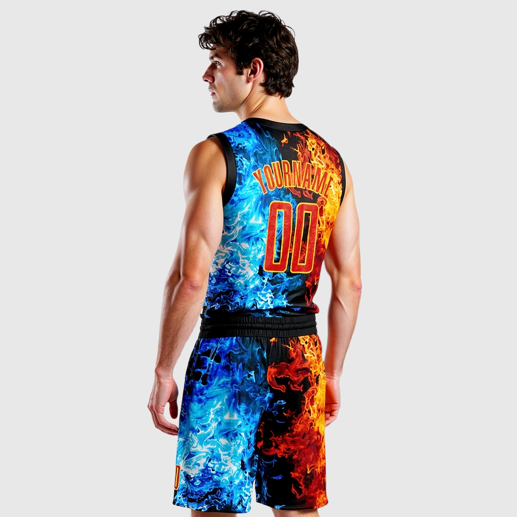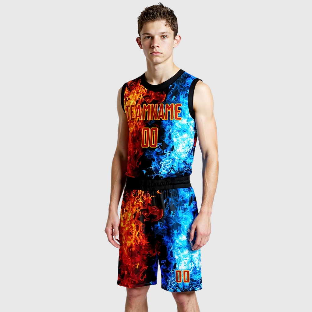 Completo da basket personalizzato Scollo Tondo Sublimazione Figura Rossa-Oro Fiamma.